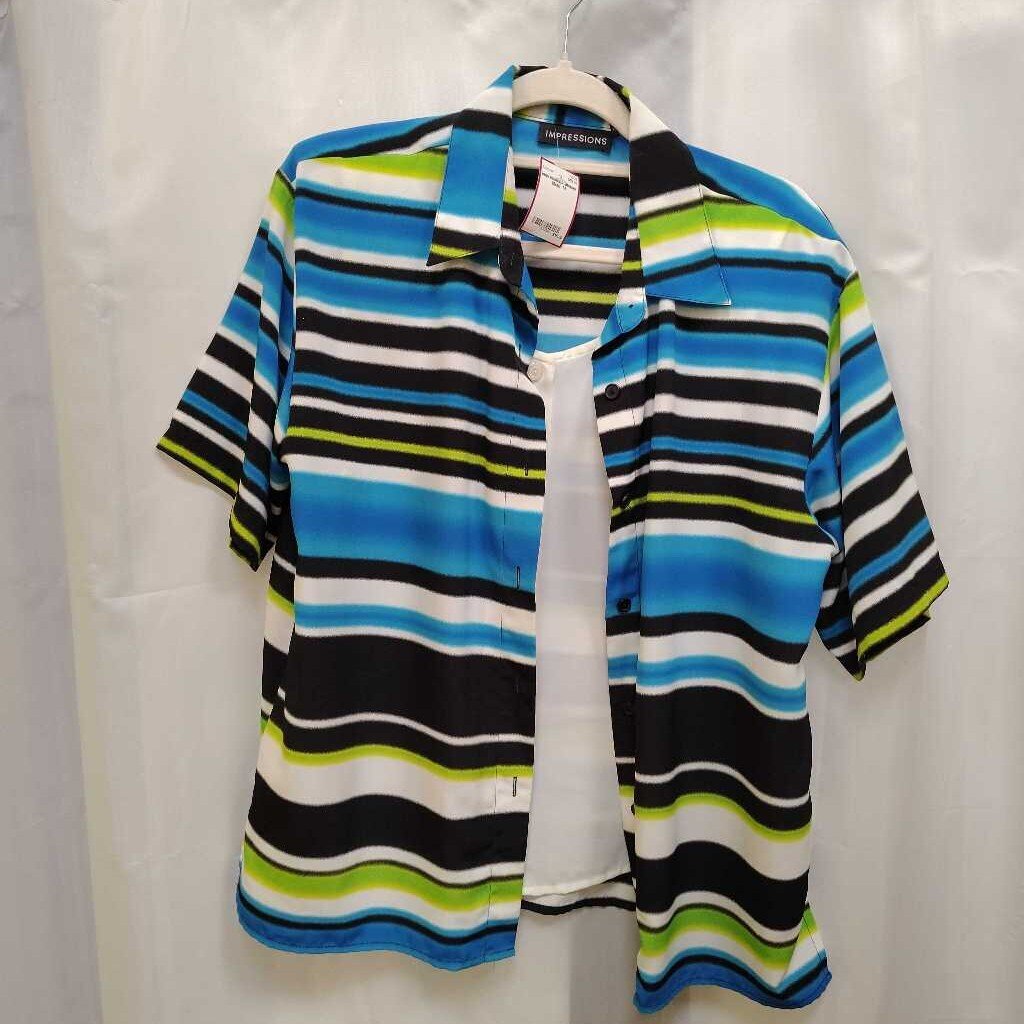 Short sleeve button front with built in cream tank underneath , various size stripes in black , white , turquoise , neon green ,