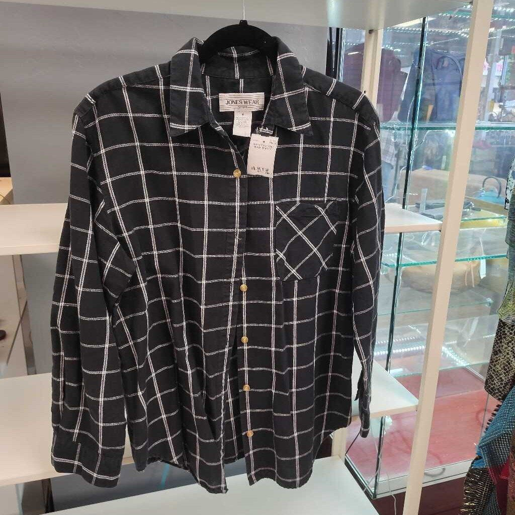 Long sleeve window pane plaid button front shirt with one pocket and collar and cuffs.