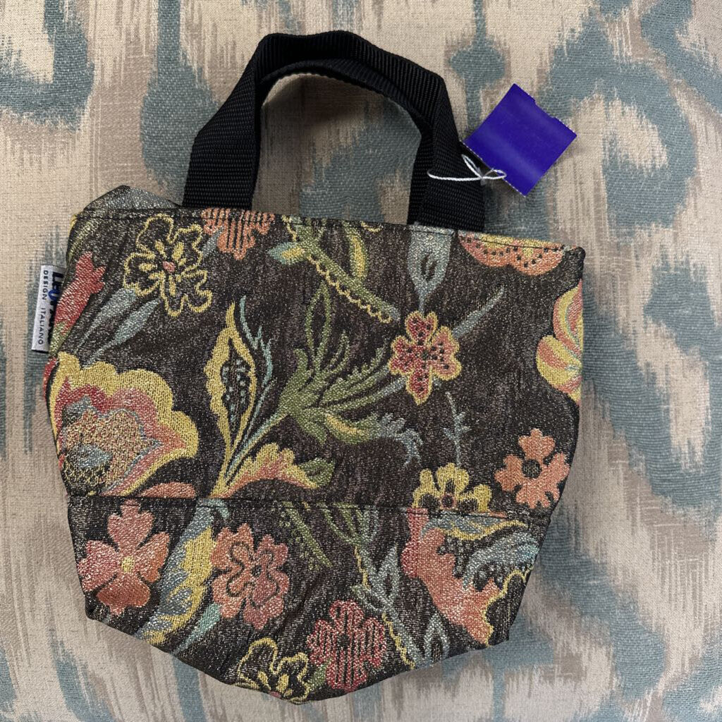 Small metallic floral jacquard tote bag with zip top closure, made in Italy.