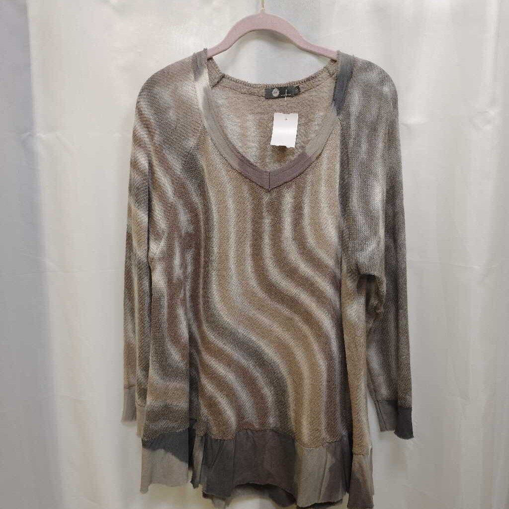 Long sleeve v neck tunic with gray and olive curvy stripes; tie dye like hem in brown and gray