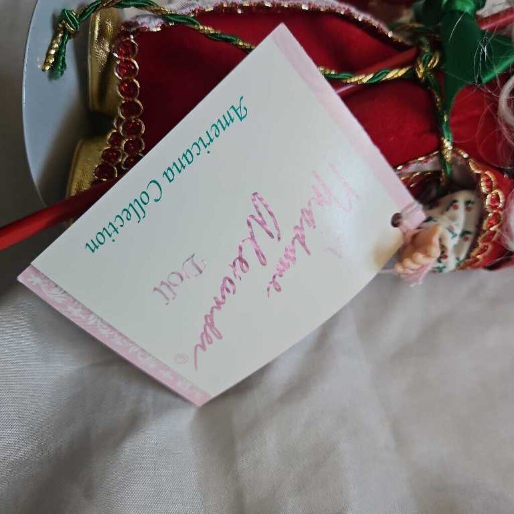 Father Christmas doll on stand with tags, holding a staff with green ribbon.
