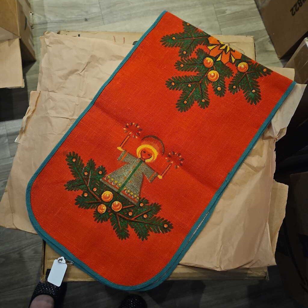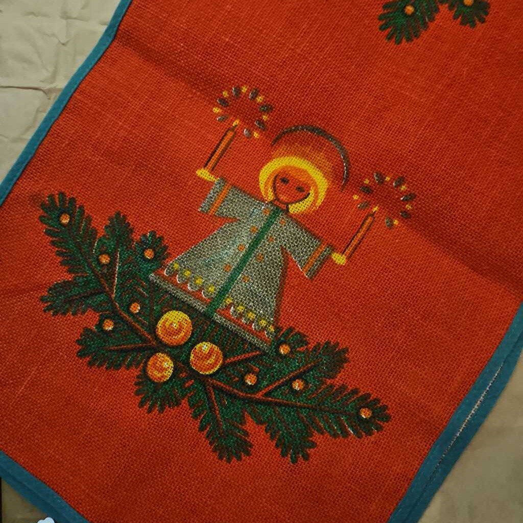 Oval shaped vintage angels jute table runner. Excellent condition.