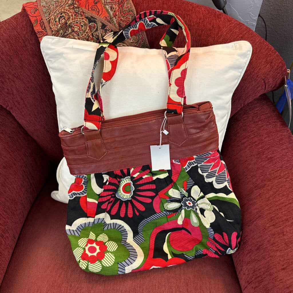 Floral printed shoulder bag with vegan leather trim and top zipper closure. New with tags.