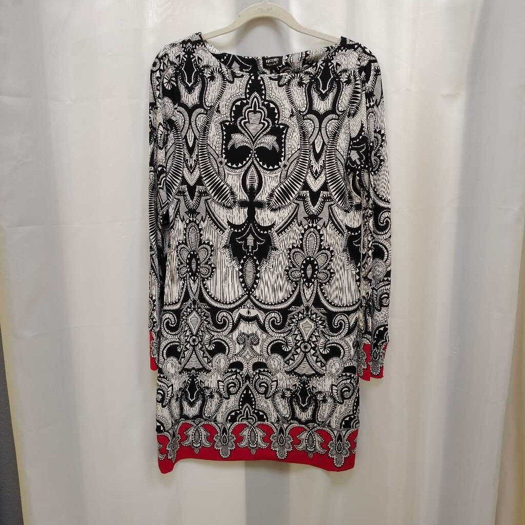 Long sleeve kneeish length with red hem , black and white paisley , scrolllike print