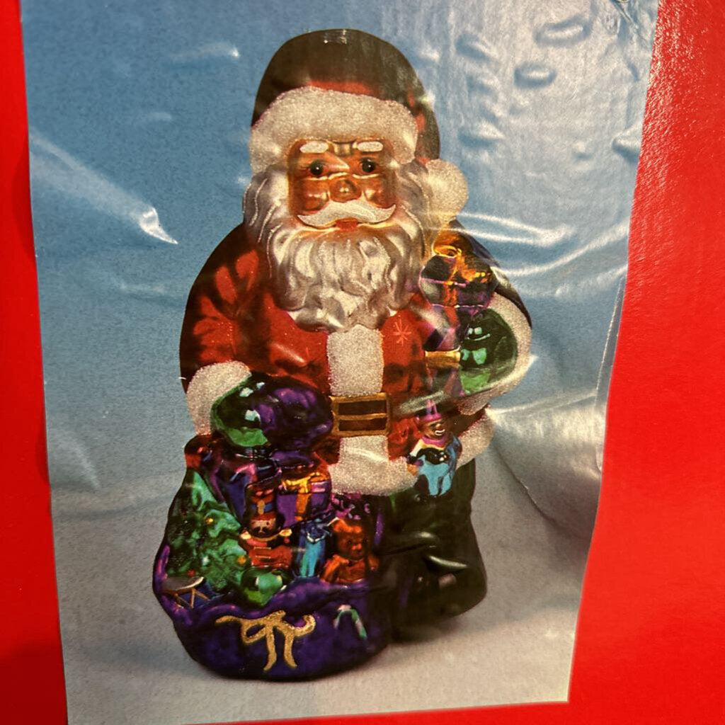 Glass Santa/painted. Holding blue gift bag full of gifts.