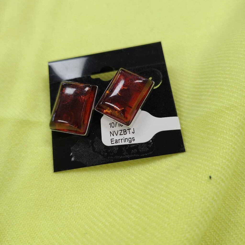 Large square amber stone stud pierced earrings.