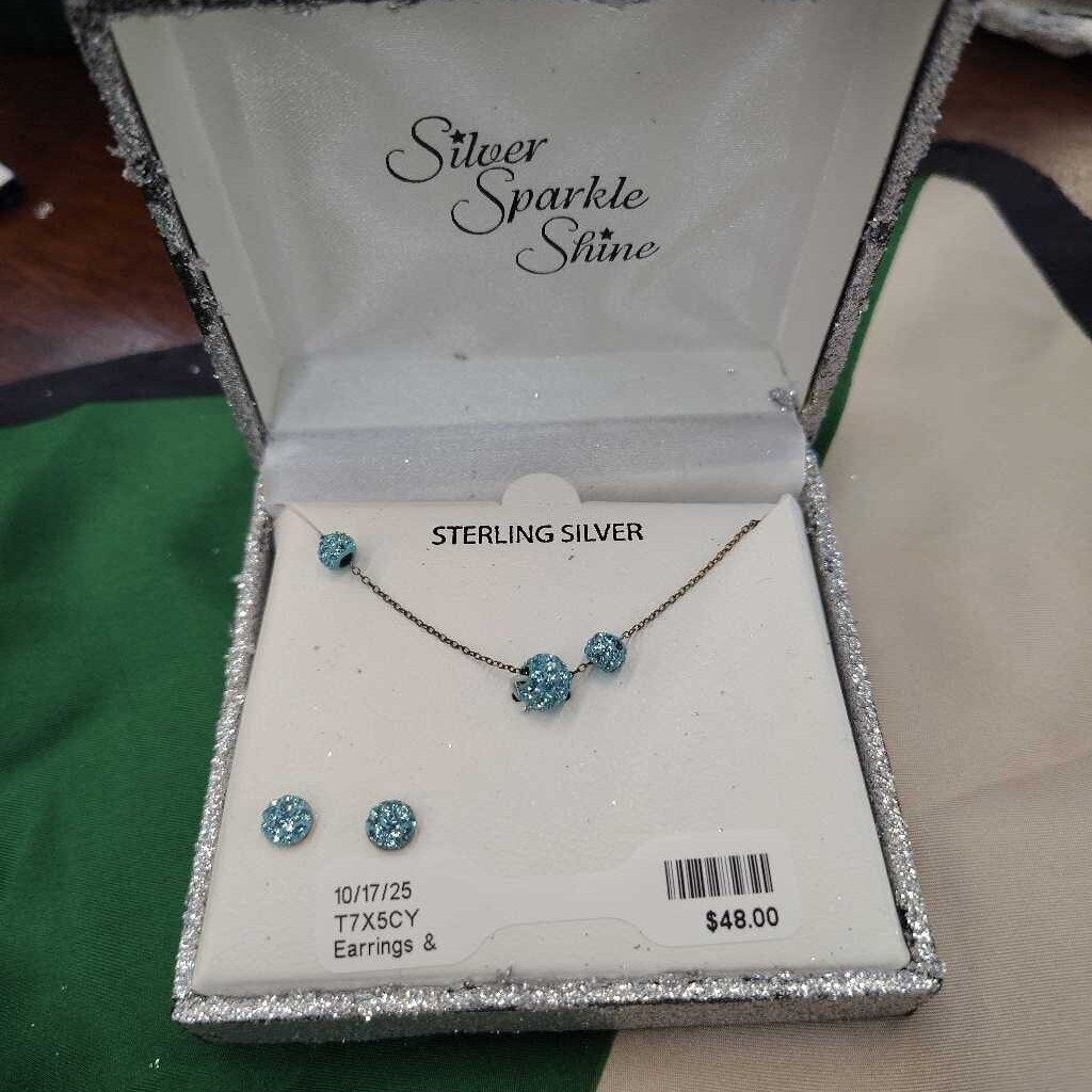 Sterling silver delicate chain necklace with teal stone accents and matching stud pierced earrings.