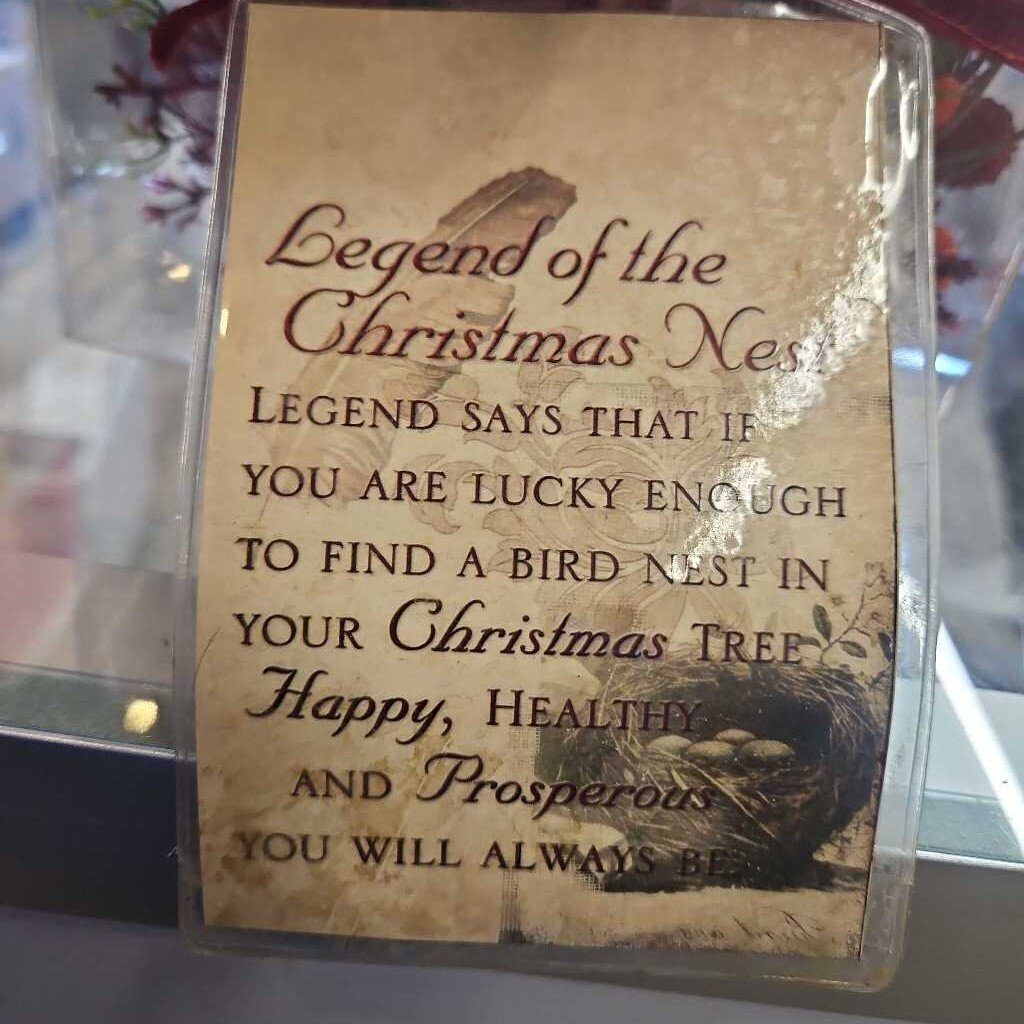 Bird nest with eggs and note with legend of the Christmas Nest attached.