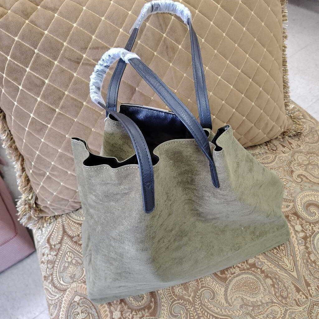 Green vegan suede tote bag with racing stripe front and double handle accents, new.
