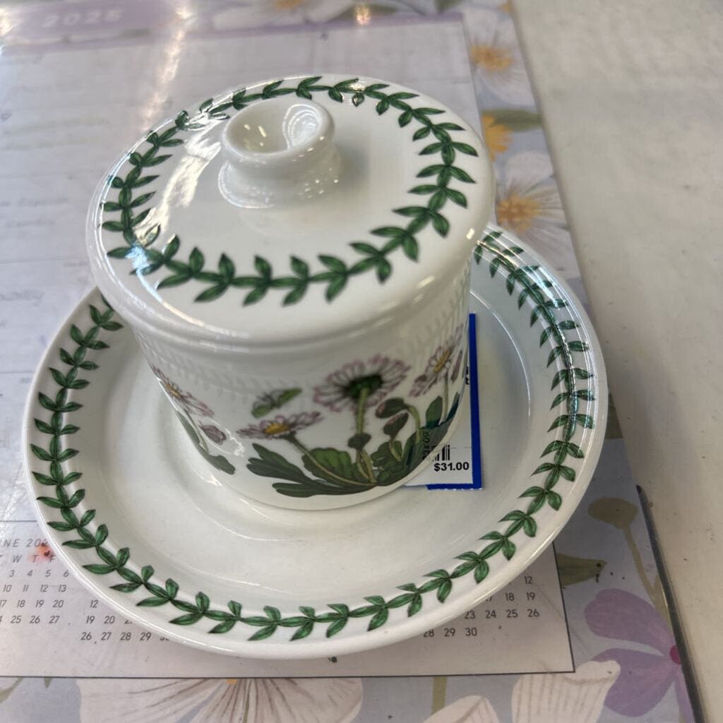 Portmeirion The Botanic Garden butter dish with lid and matching plate, three piece set.