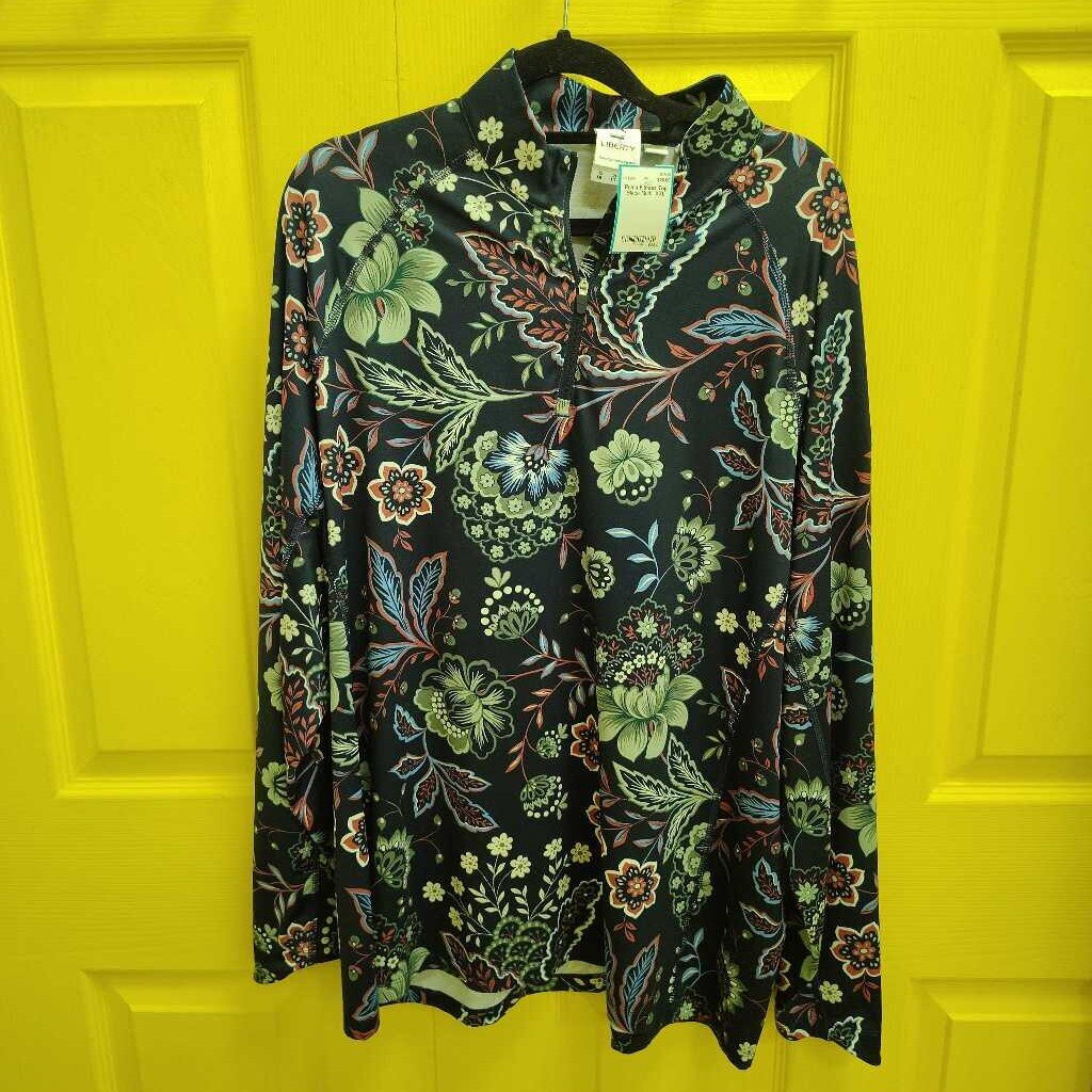 Long sleeve pullover with zip neckline , large green flowers , blue leaves