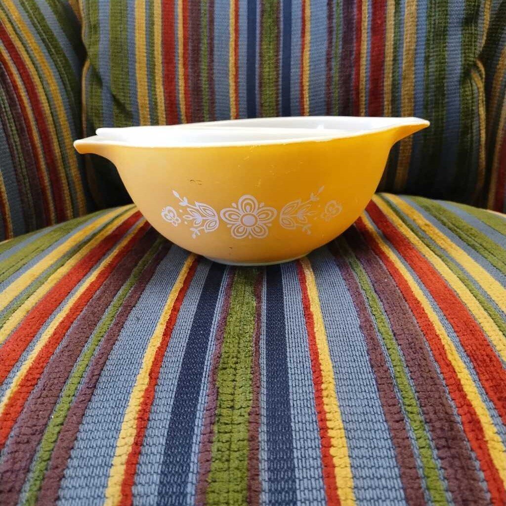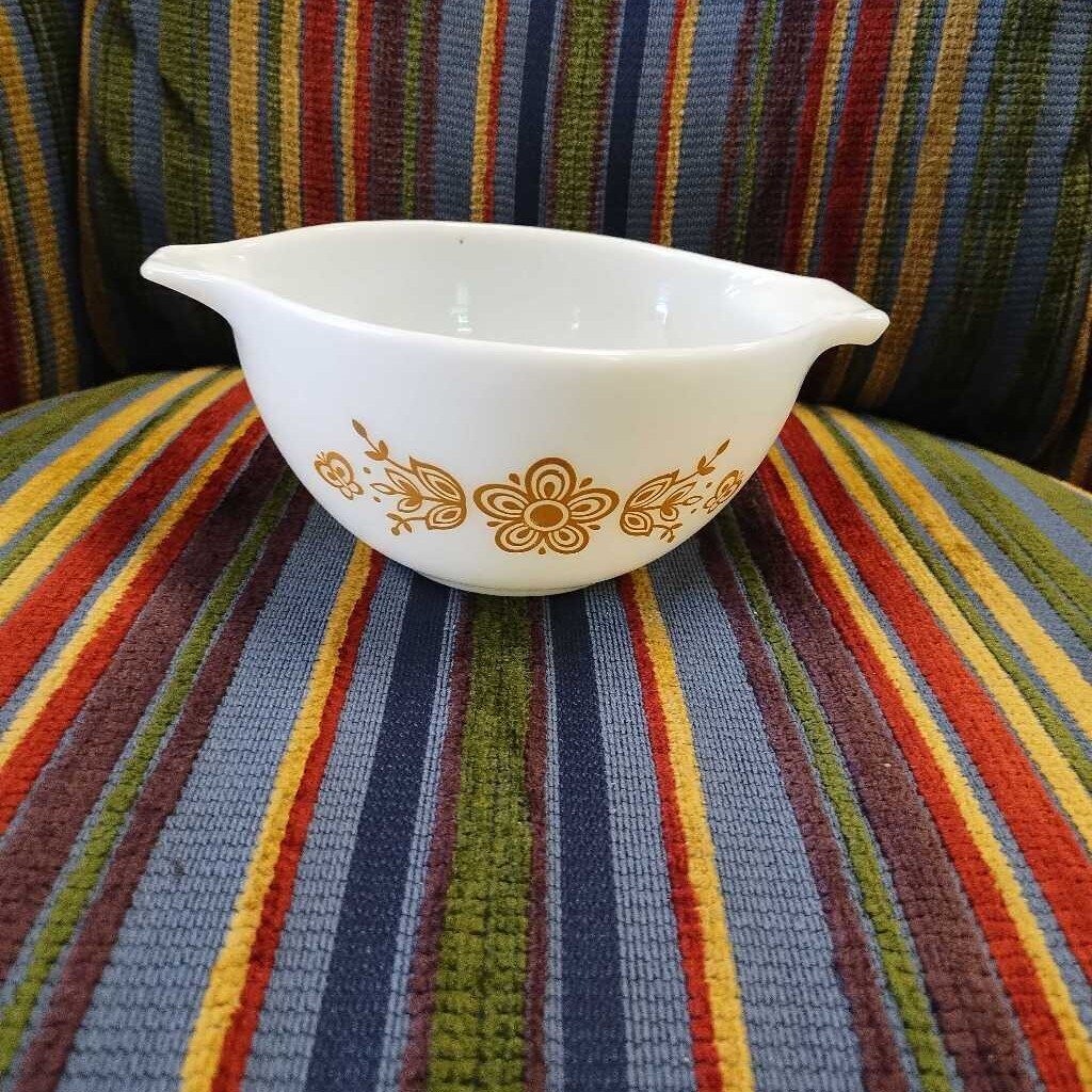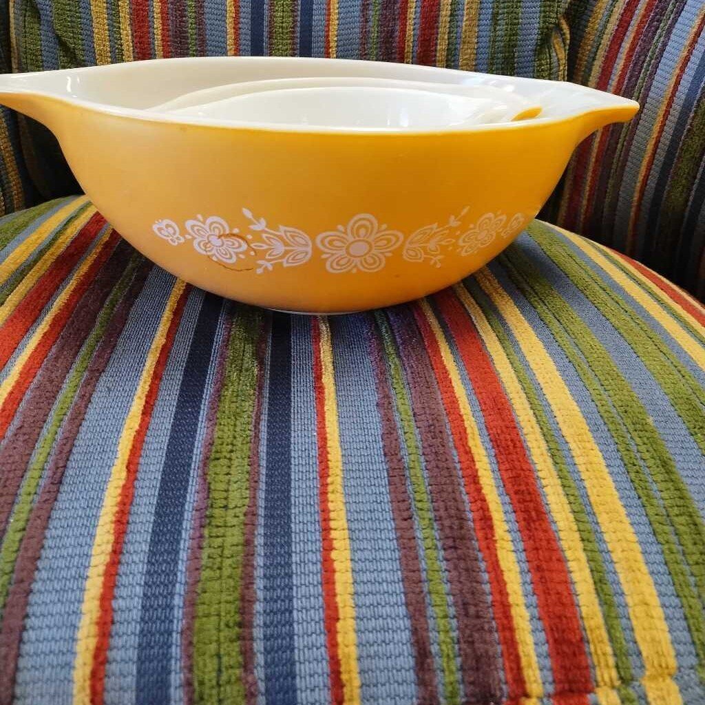 Vintage Pyrex Butterfly Gold set of three mixing bowls with two handles.
