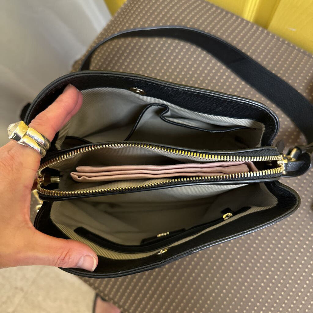 Wide adjustable strap , pebbled , 3 compartments , snap and zip closure
