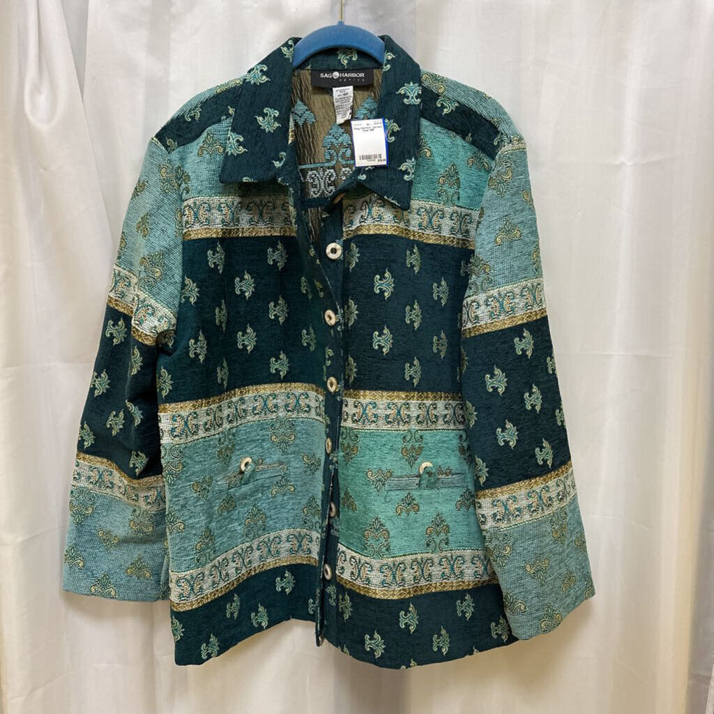 Long sleeve metallic woven chenille jacquard button front jacket with front button and loop patch pockets and collar.