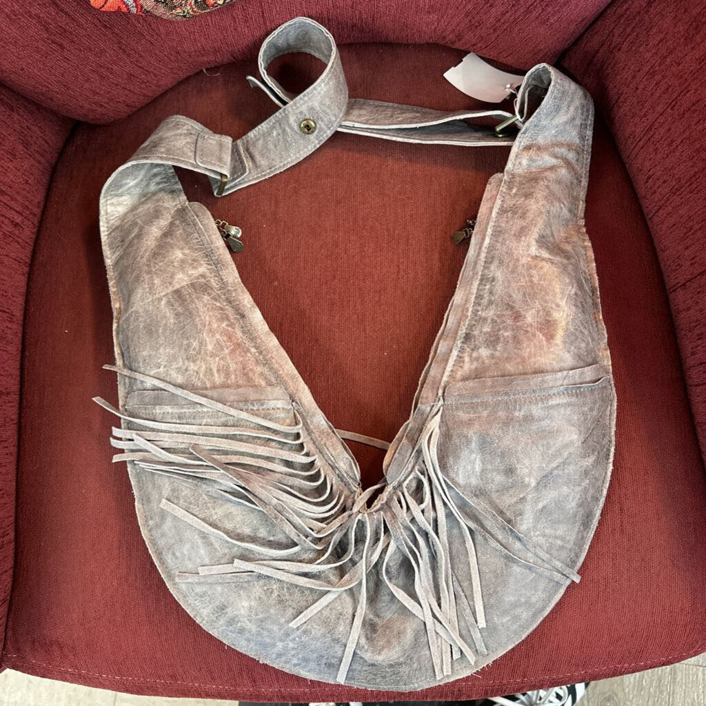 Grey leather Sash hobo bag with front fringe and antique brass hardware.