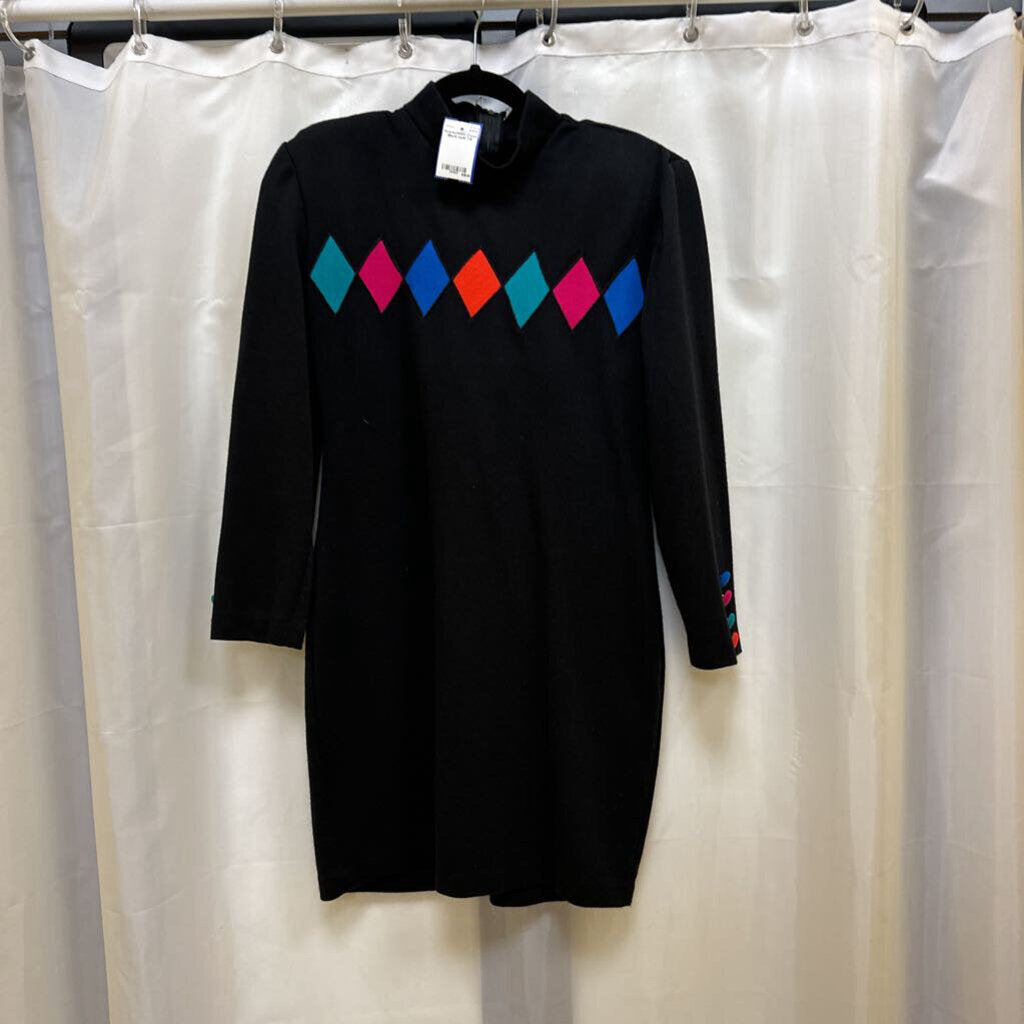 Black long sleeve, zips up back. teal, orange, blue and fuchsia diamonds on front.