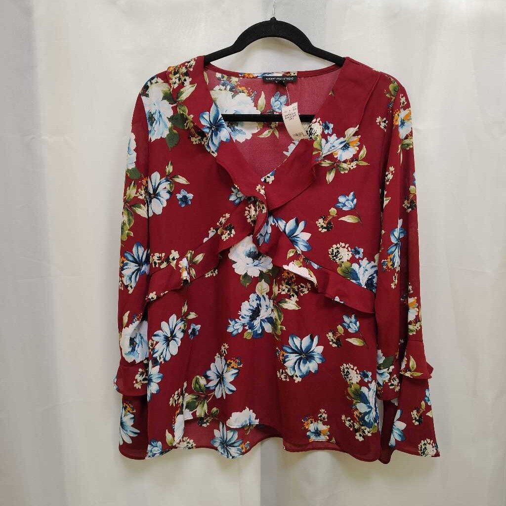 Long sleeve floral printed wrap front pull over woven blouse with ruffle trim.