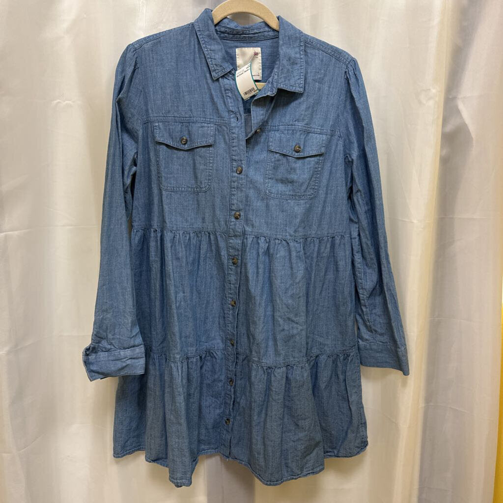 Long sleeve pull over solid denim button down short shirt dress with tiered skirt and two front pockets.