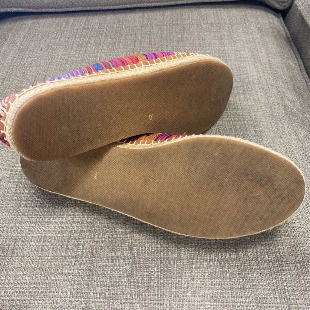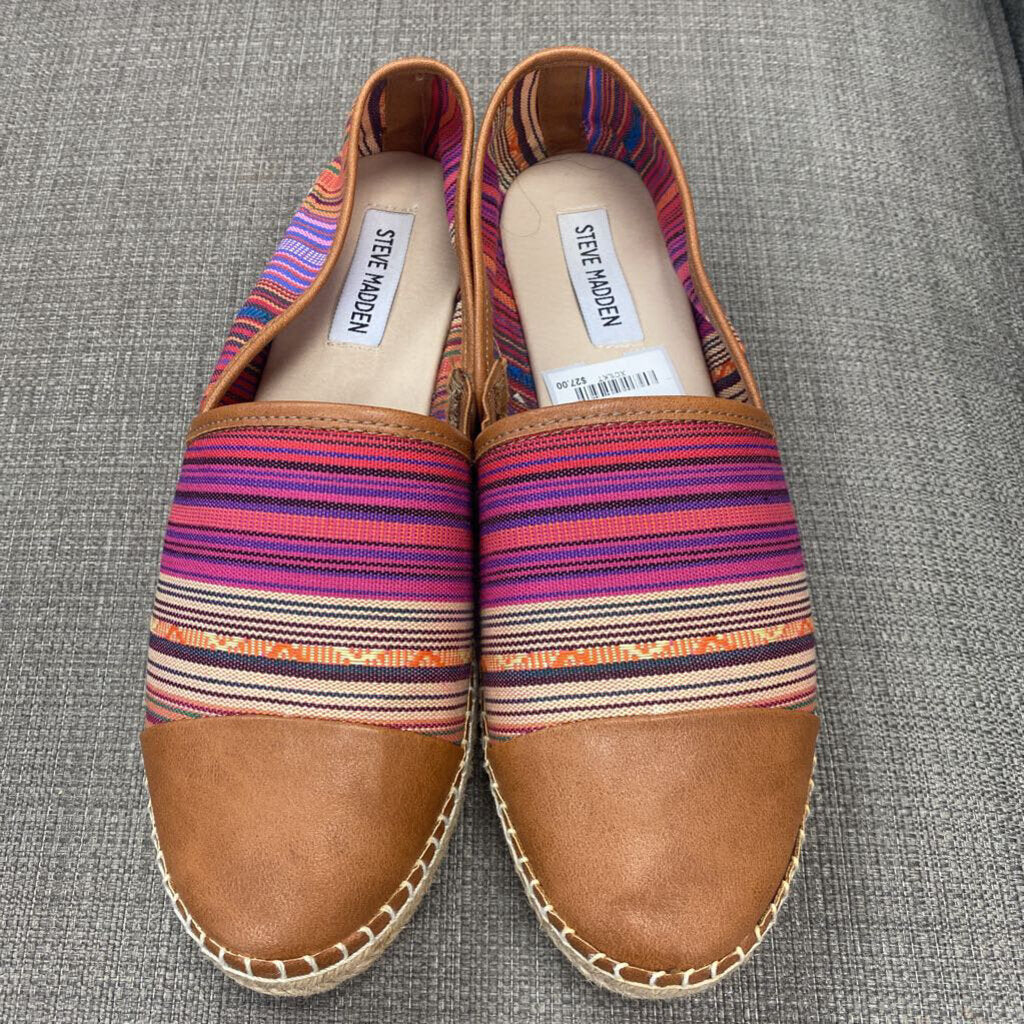 Slip on, round toe, faux leather on toes. Pink/orange/purple/brown colors.