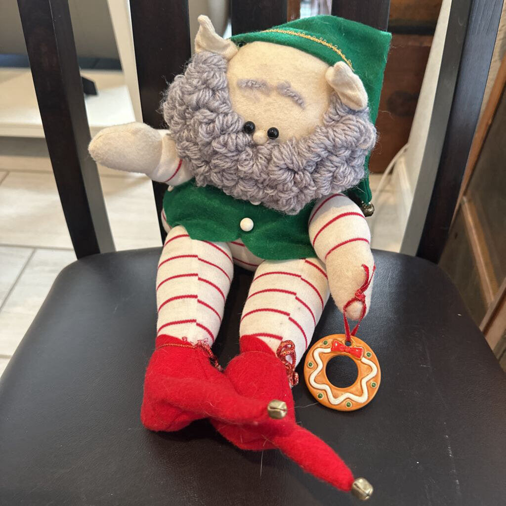 Sitting Elf-red shoes and green vest. Holding an ornament.