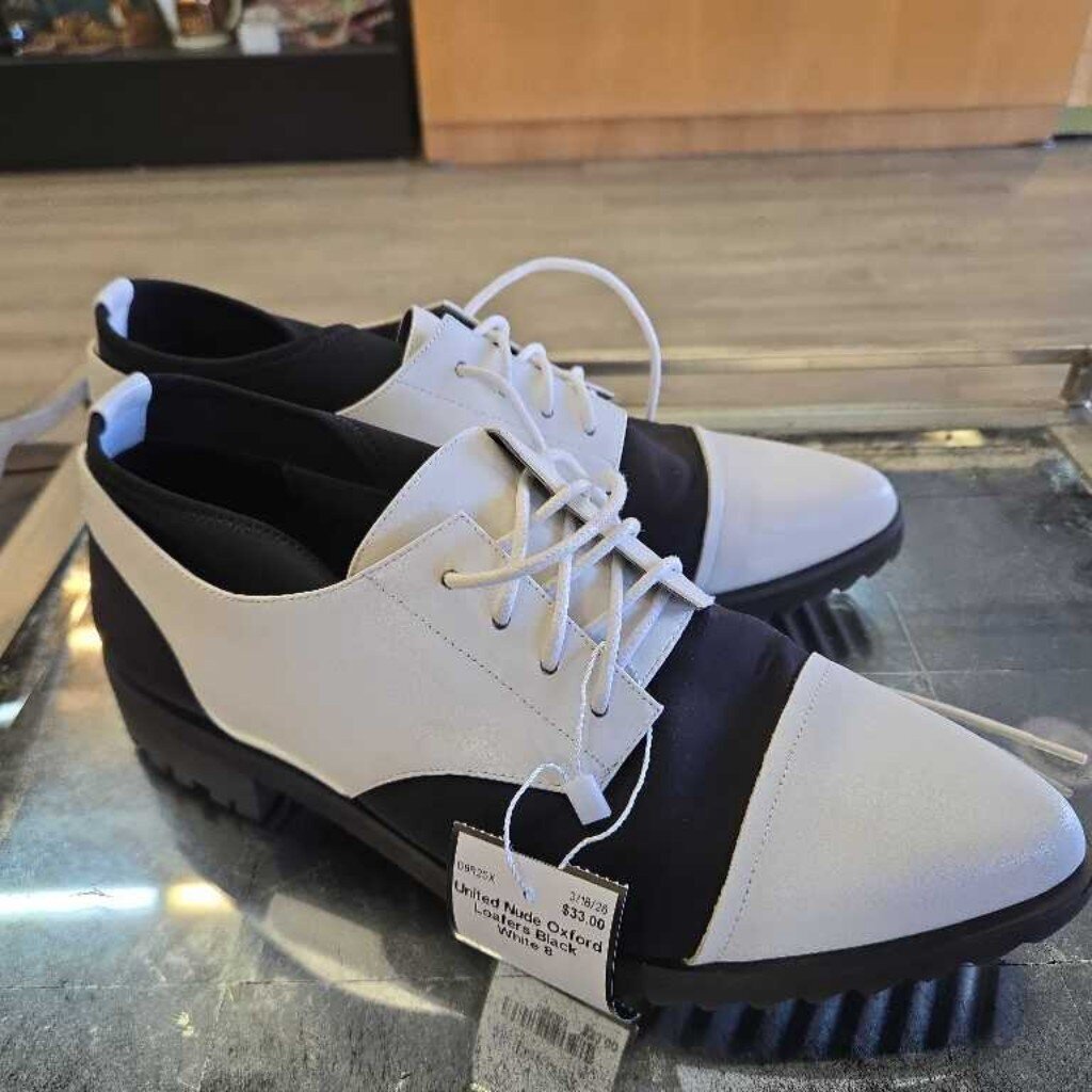 Black and white leather oxford lace up loafers with rubber lug soles.