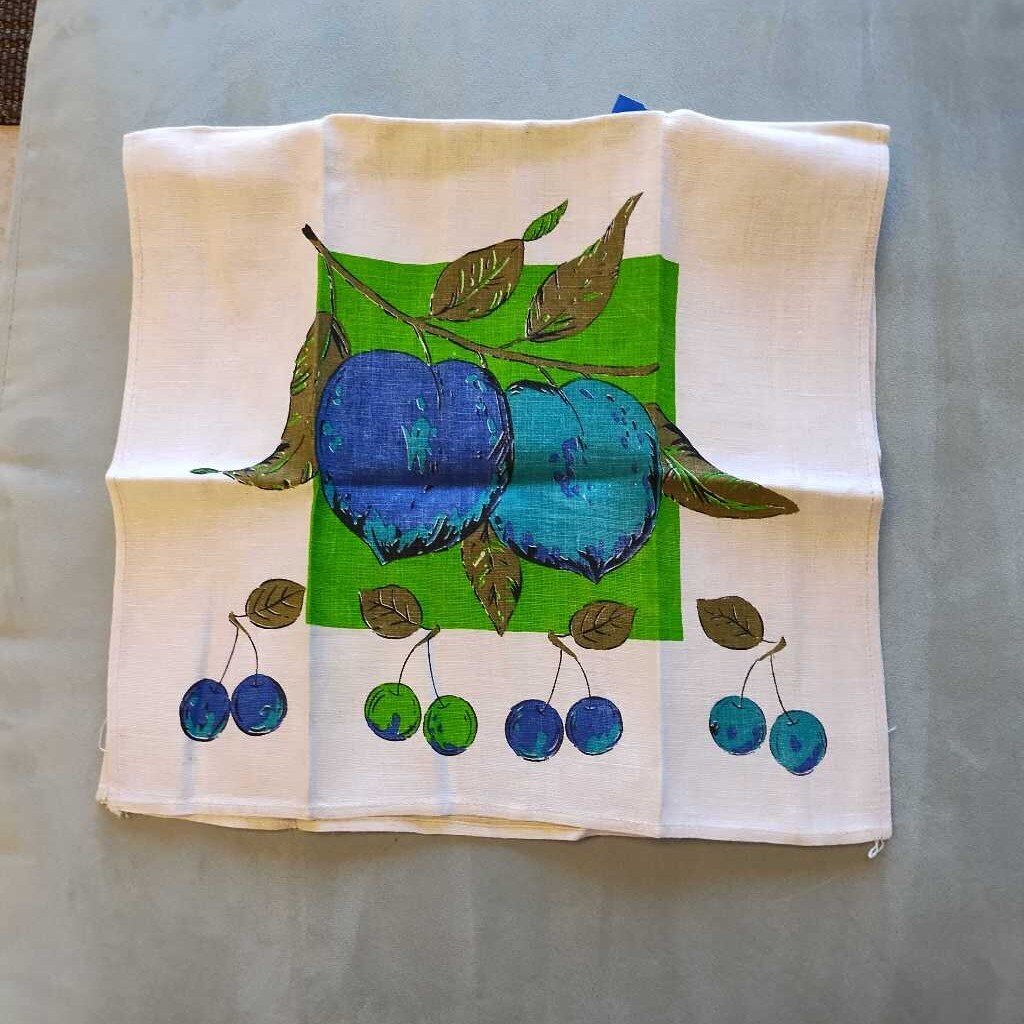 linen tea or bar towel; blue & green plum & leaf image - both sides; vintage - never used