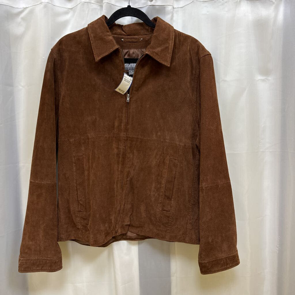 Zipper front with collar, long sleeves, front hand pockets, suede/leather. Falls past waist.