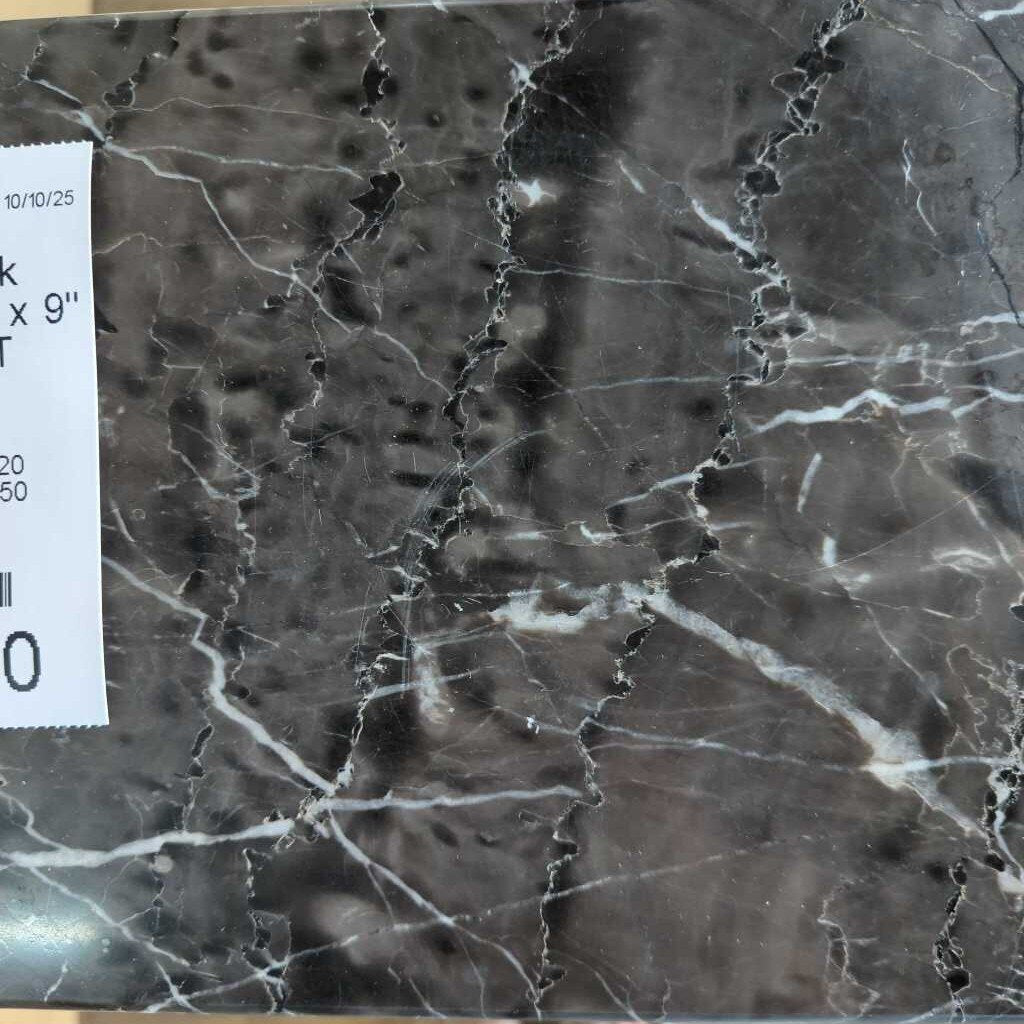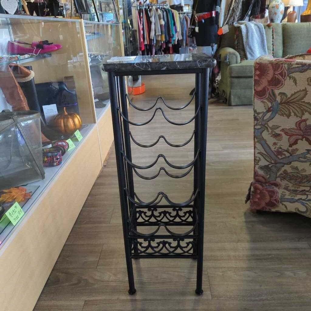 Metal framed with some decorative metal on the bottom. Has stone table top.